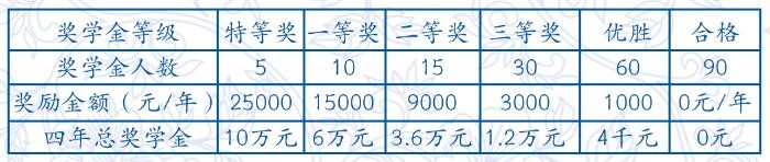 特別提示:學校獎學金實行一考定四年和每年一考相結合的特優政策。